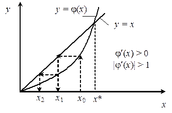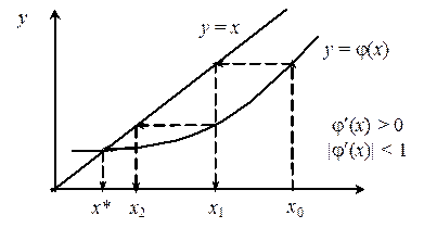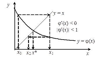 Подбирая y(x) добиваются сходимости решения (6). Она может быть монотонной (если j ' (x) > 0), или колеблющейся (если j ' (x) < 0). Метод, очевидно, является одношаговым (m =1) и для начала вычислений нужно знать одно начальное приближение x 0 = a, или x 0 = b, или x 0 = (a+b)/2.