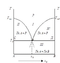 Е – точка эвтектики. Одновременно существуют три фазы: расплав и два твердых компонента.