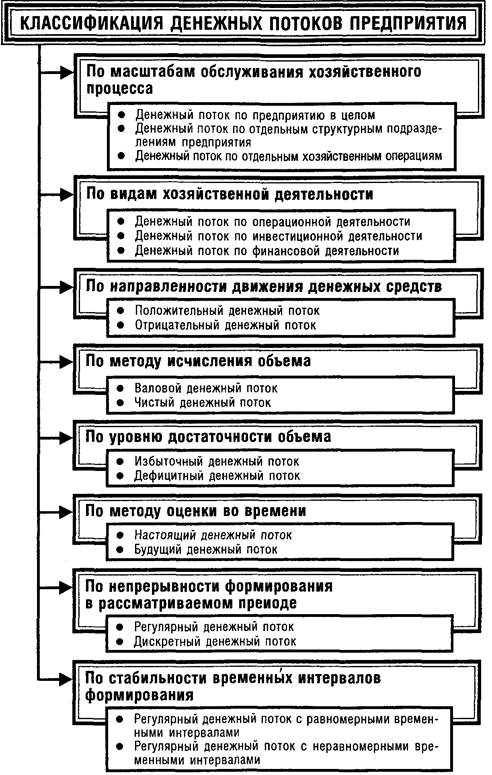 Денежный поток предприятия представляет собой совокупность распределенных во времени поступлений и выплат денежных средств, генерируемых его хозяйственной деятельностью. Понятие „денежный поток предприятия» является агрегированным, включающим в свой состав многочисленные виды этих потоков, обслуживающих хозяйственную деятельность. В целях обеспечения эффективного целенаправленного управления денежными потоками они требуют определенной классификации. Такую классификацию денежных потоков предлагается осуществлять по следующим основным признакам (рис. 13.1.):