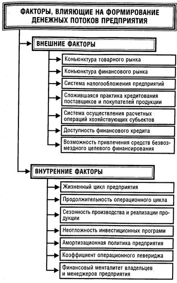 4.2. МЕТОДЫ ОПТИМИЗАЦИИ ДЕНЕЖНЫХ ПОТОКОВ ПРЕДПРИЯТИЯ Оптимизация денежных потоков представляет собой процесс выбора наилучших форм их организации на предприятии с учетом условий и особенностей осуществления его хозяйственной деятельности. Основными целями оптимизации денежных потоков предприятия являются: • обеспечение сбалансированности объемов денежных потоков; • обеспечение синхронности формирования денежных потоков во времени; • обеспечение роста чистого денежного потока предприятия. Основными объектами оптимизации выступают: • положительный денежный поток; • отрицательный денежный поток; • остаток денежных активов; • чистый денежный поток. Важнейшей предпосылкой осуществления оптимизации денежных потоков является изучение факторов, влияющих на их объемы и характер формирования во времени. Эти факторы можно подразделить на внешние и внутренние. Система основных факторов, влияющих на формирование денежных потоков предприятия, приведена на рис. 13.3. Характер влияния рассмотренных факторов используется в процессе оптимизации денежных потоков предприятия.