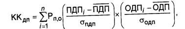 где ККдп — коэффициент корреляции положительного и отрицательного денежных потоков во времени; Рп,о— прогнозируемые вероятности отклонения денежных потоков от их среднего значения в плановом периоде; ПДПi— варианты сумм положительного денежного потока в отдельных интервалах планового периода; ПДП — средняя сумма положительного денежного потока в одном интервале планового периода; ОДПi— варианты сумм отрицательного денежного потока в отдельных интервалах планового периода; ОДП — средняя сумма отрицательного денежного потока в одном интервале планового периода; σпдп, σодп— среднеквадратическое (стандартное) отклонение сумм денежных потоков (соответственно — положительного и отрицательного).
