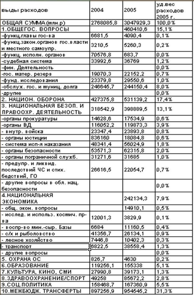 Значит внимание уделяется социальной защите наименее обеспеченных слоев населения, предусматриваются меры по повышению минимального уровня заработной платы, увеличению пособий по безработице, компенсации на питание детей дошкольного возраста. Следует иметь в виду, что крупная часть социальных расходов проходит по внебюджетным социальным фондам. Крупные расходы на оборону вызваны необходимостью развития комплекса оборонных предприятий, поддержания боеготовности армии, продолжения разработки новейших образцов вооружения, а так же усиление социальной защищенности военнослужащих, членов их семей, повышение окладов офицерского состава, ростом цен на военную продукцию и рядом других причин. Таким образом наибольшие средства направляются на содержание ВС. Недостаточные средства выделяются на фундаментальные исследования, а именно 1% от общей суммы (2005 г.). Расходы на международную деятельность включают затраты по неторговым операциям; содержание российских учреждений и представительств заграницей, уплату членских взносов. Рост затрат на правоохранительную деятельность и обеспечение безопасности обусловлен обострением криминогенной ситуации и разрешением международных конфликтов. По внешнему долгу ситуация следующая: Россия: Парижскому клубу кредиторов 1 февраля 2005 г. – 44,4 млрд.$, из которых Теперь рассмотрим расходы РФ за 2004/2005 года: