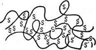 Макромолекулы растворимого компонента каучука не сшиты поперечными связями и обладают значительной степенью подвижности, которая проявляется в легко осуществляемой деформации. С практической точки зрения чрезвычайно важно улучшать механические и химические свойства материала. Сырой каучук быстро размягчается, на него оказывают влияние свет и кислород, особенно его аллотропная форма – озон. В результате свойства такого каучука из-за естественного и искусственного старения ухудшаются. Следует также учитывать, что для некоторых целей сырой каучук вообще непригоден. Поэтому значительные усилия прилагаются для улучшения свойств каучука. Методы, используемые для этой цели, так же различны, как разнообразны продукты, получаемые из каучука, хотя все работы в конце концов сводятся к структурированию волокнистых макромолекул. Добиться этого можно различными средствами, но особенно важна обработка каучука серой и серосодержащими соединениями. Такой технологический процесс, в котором пластичный каучук превращается в резину («сшивание» гибких макромолекул в трехмерную сетку) называется вулканизация. С исходным материалом смешивают целый ряд веществ в зависимости от того, какой конечный продукт необходимо получить. Например, каучук для покрышек содержит около 3 % серы, 4 % оксида цинка и 40 – 50 % сажи (наполнитель). Кроме того, в него добавляют небольшие количества стеариновой кислоты, смолы (мягчитель) и т. д. Это делается для улучшения смешиваемости компонентов. Для повышения стабильности каучука к нему добавляют небольшое количество антиоксиданта. Затем смеси придают необходимую форму и осуществляют смешивание нагреванием при определенной температуре. Следует отметить, что при производстве высокоэластичных изделий, таких как хирургические перчатки, сажа не добавляется. Сера и оксид цинка реагируют с цепями, образуя при этом поперечные связи типа С—S—С или С—S—S—С или С—S—Zn—S—С