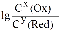 T – температура в градусах Кельвина, F – число Фарадея (заряд электронов количеством 1 моль, 96500 кл/моль), С(Ox) и С(Red) – молярные концентрации окисленной (oxidation) и восстановленной (redaction) форм веществ, входящие в состав полуэлементов; x, y – соответствующие стехиометрические коэффициенты в уравнении реакции.
