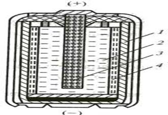 1 – анод (корпус, изготовленный из цинка); 2 – катод (диоксид марганца в смеси с графитовым порошком, для увеличения электропроводности); 3 – токоотвод из графита; 4 – электролит (паста из хлорида аммония в смеси с загустителем (крахмал или др.).