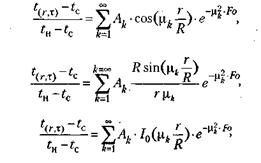 где t(r,x), °C - температура в любой точке продукта на отрезке г, м, за время r -текущая координата точки; R - характерный геометрический размер продукта (половина толщины - для пластины, и радиус - для шара и цилиндра). Для поверхности продукта значение t(r, Для центра r = 0; tc - температура теплоотводящей среды, °С; I0(х)- модифицированная функция Бесселя нулевого порядка I-го рода; Ак и цк - коэффициенты ряда Фурье (Fo) и корни соответствующих характеристических уравнений. Ак и цк находят по величине числа Bi из справочника приложения(для пластины, для шара). Теплофизические характеристики продуктов