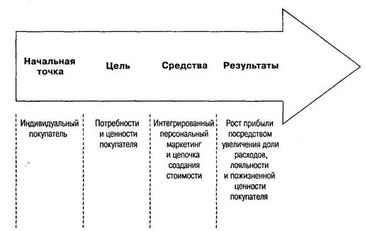 Концепция покупателя Сегодня многие компании, не ограничиваясь концепцией маркетинга, идут дальше и внедряют концепцию покупателя.Идеи этой концепции представлены на рис. 1.3. Если практикующие маркетинговую концепцию компании работают на уровне покупательских сегментов, то передовые фирмы разрабатывают товары, услуги и сообщения для индивидуальных покупателей. Для каждого конкретного клиента эти организации собирают информацию о прошлых покупках, демографических и психографических характеристиках, предпочитаемых средствах информации и способах совершения покупок. Их конечная цель — рост прибыли посредством увеличения доли расходов каждого клиента за счет увеличения лояльности и фокусировании на жизненных ценностях покупателя.