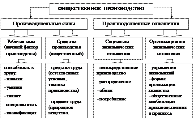 Экономическое содержание общественного производства Методы познания экономических явлений. Метод – это совокупность приемов, способов, принципов, с помощью которых определяются правильные пути достижения поставленных целей. Если предмет науки характеризует объект исследования, то метод – чем и как исследовать. Экономическая теория использует широкий спектр методов. Важнейшими из них являются: - метод научной абстракции – освобождение наших представлений о предмете исследования от случайного, кратковременного, нетипичного и нахождение в них сущностного, постоянного, типичного; - метод анализа и синтеза. Анализ – это расчленение изучаемого экономического явления на отдельные элементы и исследование каждого элемента как необходимой составной части целого. Синтез – соединение родственных элементов в единое целое и описание общих выводов. - метод индукции и дедукции. Индукция – это движение мысли от частного к общему умозаключению. Дедукция – напротив, движение мысли от общего к частному умозаключению. - метод количественного и качественного анализа; - метод исторического и логического единства предполагает, что любое экономическое явление раскрывается в историческом развитии и последовательно; - метод графического изображения выражается в том, что ряд положений ЭТ может быть изображен графически; - ЭММ – это системный комплексный метод исследования экономических явлений с использованием математики и компьютерной практики; - экономические эксперименты – искусственное воспроизведение экономических явлений в благоприятных условиях в целях дальнейшего практического использования. Экономическую теорию образно можно считать стволом дерева, а совокупность конкретных экономических наук, изучающих отдельные стороны экономической жизни общества, - кроной. Основой жизни и развития человеческого общества является общественное производство. В экономической науке общественное производство исследуется с двух сторон – материально-вещественной и социальной (общественной) и выражается через категории «производительные силы» и «производственные отношения» (рис. 1.1).