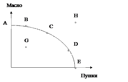Границу производственных возможностей, т. е. все комбинации товаров, которые будут произведены при условии эффективного использования всех общественных ресурсов, можно показать графически при помощи кривой производственных возможностей (рис. 1.3). Наклон КПВ отражает альтернативную стоимость масла, выраженную в пушках. Находящиеся на КПВ точки (А, В, С и др.) соответствуют полной занятости и эффективному использованию ресурсов.