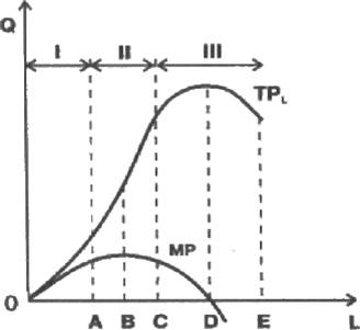 Обозначения на рисунке 6.1.: Q – объем производства; L –переменный ресурс (производственные рабочие); ТРL - валовой продукт; МР- предельный продукт по переменным. Отрезок ОА — это этап возрастающей отдачи от использования переменного ресурса. На отрезке АС функция валового продукта (ТРL) продолжает возрастать, но с замедляющейся скоростью. Точка В - точка перегиба, кривая ТРL выгибается книзу. Функция предельного продукта (МР), достигает максимума в точке В. Отрезок АС - переходный между этапом растущей и падающей отдачи. С некоторым упрощением его можно назвать этапом постоянной отдачи. На отрезке СЕ функция валового продукта (ТРL) сначала растет замедляющимися темпами, а достигнув максимума в точке D, становится убывающей. Функция предельного продукта (МР) все это время убывает, а с точки D становится отрицательной. Это значит, что использование дополнительных единиц переменного ресурса приводит сначала к замедлению роста объема производства, а потом его сокращению.