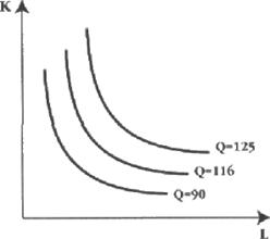 Лекция Производственная функция. В неоклассической теории производства любая производственная функция (ПФ) обладает рядом свойств: 1. ПФ - модель конкретной технологии. Именно от нее зависит, какой вклад вносит каждый из ресурсов в создание готовой продукции. Новая технология — новая производственная функция. 2. ПФ - это модель эффективного производства. То есть она описывает, каким может быть максимально возможный выпуск продукции при затратах данного количества ресурсов. Либо (что, то же самое) каково минимально необходимое количество ресурсов для производства данного объема продукции. 3. ПФ - исходит из взаимодополняемости и взаимозаменяемости ресурсов. Например, ресурс «капитал» дополняет ресурс «труд», сливаясь с ним в едином производственном процессе и одновременно, может заменять его: более механизированное производство требует меньшего числа рабочих. Для изучения ПФ подробнее рассмотрим известные нам категории эффекта масштаба производства и отдачи от фактора производства. Масштаб производства задается ПФ. Задача фирмы сводится к тому, чтобы обеспечить минимизацию издержек при каждом заданном объеме производства. Для выявления возможных комбинаций факторов при выпуске заданного объема продукции в экономической теории используется понятие изокванты. Изокванта представляет собой кривую, любая точка на которой показывает различные комбинации двух переменных факторов, обеспечивающие один и тот же объем выпуска продукции. Все комбинации факторов производства, представленные на изокванте, являются технологически эффективными. Несколько изоквант называются картой изоквант (смотрите рис 6.8.).