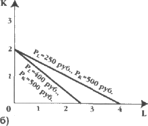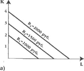 Рис. 6.9. Изокоста, а) при разных бюджетах; б) при разных ценах на ресурсы.