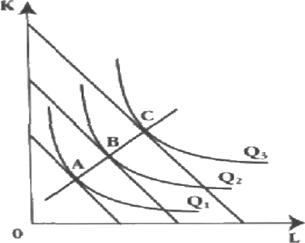 Для определения самого дешевого сочетания факторов для каждого заданного объема выпуска необходимо совместить карту изоквант с изокостами. Точки касания изокост с изоквантами покажут оптимальные сочетания - равновесие производителя Принимая решение об объемах производства, фирма будет двигаться вдоль кривой А, В, С, которую принято называть траекторией роста (смотрите рис 6.10).