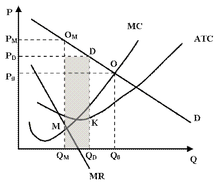 Рис 7.4. Выбор оптимального размера производства фирмой-монополистом Второй особенностью монополистического рынка по сравнению с другими типами несовершенной конкуренции является низкая эластичность спроса и соответственно большая крутизна его кривой D. Низкая эластичность спроса на товар фирмы-монополиста объясняется его уникальностью и незаменимостью, отсутствием конкурирующих товаров, на которые мог бы переместиться спрос. Степень несовершенства рынка возрастает по мере роста неэластичности спроса на продукцию (при совершенной конкуренции спрос абсолютно эластичен, при монополистической конкуренции отличается высокой эластичностью). При монополии степень несовершенства рынка достигает максимального уровня. (недопроизводство товаров, завышение цен, тенденция к постоянному получению экономической прибыли (PМ - ATCМ > 0). Способом смягчения остроты недопроизводства без нарушения интересов монополиста является ценовая дискриминация. Треугольник OМОМ на рисунке называют «мертвым грузом», поскольку он представляет собой объем производства, пропавшего как для потребителей, так и для монополиста. Кривая предельных издержек МС проходит на этом участке ниже кривой спроса D. т. е. для каждой дополнительной единицы продукции, в интервале от QМ до Q0, в принципе нашелся бы потребитель, готовый заплатить больше, чем составили издержки ее производства. Монополист был бы рад продать саму по себе QD-ю единицу продукции по цене PD. Но чтобы реализовать весь объем выпущенной продукции (от нулевой до QD-й единицы), общий уровень цен на них пришлось бы снизить с оптимальной величины PМ до PD. А это уже сократило бы прибыль. Нельзя ли все-таки продавать одну часть продукции по одной, а другую по иной цене? Ценовая дискриминация как раз и предполагает продажу одинаковых товаров и услуг разным покупателям по разным ценам.