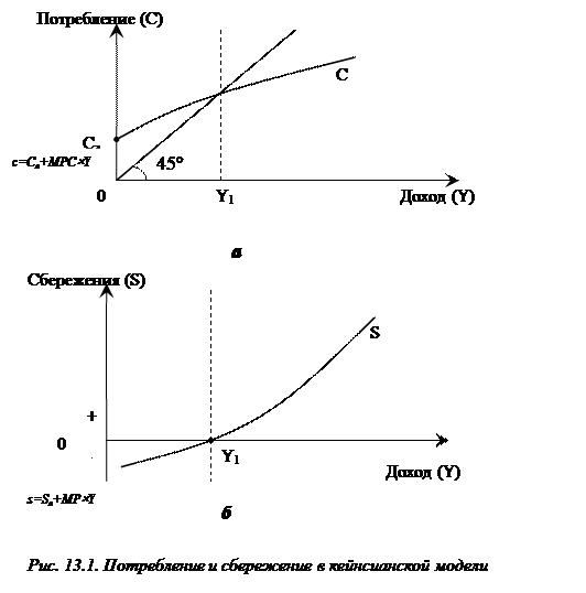 мы получим 1 = МРС + MPS. Предельная склонность к потреблению и предельная склонность к сбережению — это величины стабильные на небольших интервалах времени. В развитых странах предельная склонность к потреблению составляет сегодня величину 0,7 — 0,8, а предельная склонность к сбережению — 0,2 — 0,3. Основной психологический закон, как показывают эмпирические проверки, находит подтверждение не только на уровне одного домашнего хозяйства, но и на макроэкономическом уровне. В результате выстраиваются функции потребления и сбережения и их графики (рис. 1). Поскольку эти функции связаны между собой, графики расположены друг под другом так, чтобы связь между ними была видна. Сами функции для простоты записываются в линейном виде, так как, и это было отмечено выше, на небольших интервалах предельная склонность к потреблению и предельная склонность к сбережению, определяющие соответственно углы наклонов графиков потребления и сбережения (МРС — тангенс угла наклона графика потребления; MPS — тангенс угла наклона графика сбережения), — величины стабильные. Проанализируем построение графика функции потребления (рис. 13.1., а). Поскольку потребление зависит от дохода, оси координат определены: доход — потребление. Прежде всего строится линия, выходящая из начала координат под углом 45°. Это вспомогательная линия, которая показывает, что было бы, если бы весь доход полностью потреблялся (ее еще можно назвать линией нулевых сбережений). Затем выстраивается линия потребления. Линия потребления на нашем графике начинается не из нуля, а из некоторого уровня Са — автономное потребление. Автономные величины — это величины, не зависящие от уровня дохода. В данном случае показано потребление, обусловленное прожиточным минимумом, т.е. независимо от уровня дохода это потребление должно быть в обществе, иначе общество погибнет.