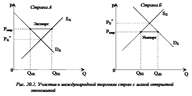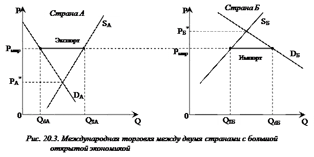 Страна A, в которой существующая мировая цена превышает равновесную внутреннюю цену PA * и которая, следовательно, имеет избыточное предложение этого товара, станет экспортировать излишек (Q dА – Q SA). Страна Б, у которой внутренняя равновесная цена PБ * превышает сложившуюся мировую цену и которая, следовательно, имеет избыточный спрос на этот товар, станет импортировать недостающее его количество (Q dБ - QSБ). При торговле между двумя странами с большой открытой экономикой (рис.20.3.) мировая цена устанавливается на таком уровне, чтобы общий объем спроса на данный товар обеих стран был полностью удовлетворен суммарным объемом предложения этого товара обеими странами, т.е. чтобы Q dА + Q dБ = Q SA + QSБ . Тогда объем экспорта из страны А (Q SA - Q dА ) точно совпадает с потребностью в импорте страны Б (Q dБ - QSБ), т.е. (Q SA - Q dА ) = (Q dБ - QSБ).