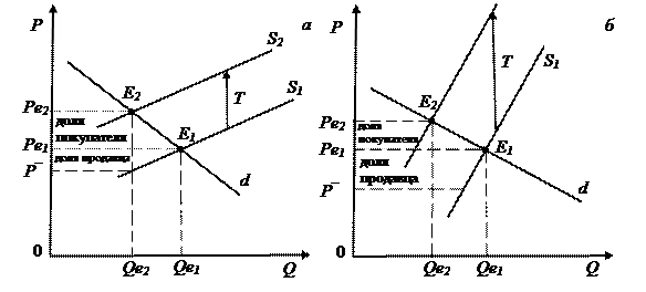 Рис. 2.7. Воздействие на рыночное равновесие потоварного налога, уплачиваемого продавцами Новое равновесие характеризуется тремя величинами: Qе2, Pе2, P–. Объем рынка Qе2 будет меньше первоначального Qе1. Цена, которую платит покупатель Pе2, окажется выше первоначальной цены Pе1. Цена, которую фактически получает продавец (после уплаты налога) P–, окажется ниже первоначальной. Общая сумма налога, поступающая в государственный бюджет, будет соответствовать площади прямоугольника Pе2E2ВP–. Следует обратить внимание на следующий факт. Несмотря на то, что весь налог вносится в госбюджет продавцами, часть налогового бремени возлагается на покупателей. Покупатель заплатит продавцу цену Pе2, которая выше прежней цены на величину (Pе2 – Pе1). Это «доля» покупателя в потоварном налоге. Продавец же за каждую проданную единицу товара фактически получит цену P–. Его «доля» в налоге составит величину Распределение налогового бремени между покупателями и продавцами зависит от соотношения наклонов линий спроса и предложения. Если спрос на товар неэластичный, то линия спроса имеет довольно крутой наклон. При этом, если предложение достаточно эластично по цене, линия предложения в будет иметь пологий наклон. Эта ситуация изображена на рис. 2.8 а. Из него видно, что большая часть налогового бремени (Pе2 – Pе1) возлагается на покупателей и меньшая часть (Pе1 – P–) – на производителей. Для сравнения на рис. 2.8 б изображена противоположная ситуация. Можно сделать следующий вывод: чем больше наклон линии спроса и чем меньше наклон линии предложения, тем большая часть налога ложится на потребителей и тем меньшая часть налога ложится на производителей.