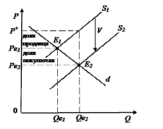 Рис. 2.8. Распределение налогового бремени между покупателями и продавцами в зависимости от соотношения наклонов линий Таким образом, итогом введения потоварного налога является следующее: перераспределение налогового бремени между покупателями и продавцами; увеличение цены на товар и, как следствие, сокращение объема продаж. Дотации. Дотация выступает как налог «наоборот». Потоварная дотация устанавливается либо в определенном проценте к цене товара, либо в абсолютной (в рублях) сумме в расчете на единицу товара. Потоварные дотации обычно получают производители, хотя в принципе их непосредственно могут получать и потребители. Рассмотрим воздействие на рыночное равновесие потоварной дотации (рис. 2.9). Допустим, что государство ввело дотацию производителям детских книг в размере V рублей на каждую единицу продукции. Линии спроса и предложения сначала занимали положения соответственно d1 и S1. Равновесный объем продаж составлял Qе1, а равновесная цена – Pе1. Это приведет к сдвигу линии предложения на V руб. вниз. Действительно, если ранее производители согласны были предложить на рынке количество товара, скажем, Qе1 по цене Pе1, то теперь они согласятся предложить на рынке то же количество товара, если цена без дотации будет на V руб. ниже цены Pе1. В результате, объем продаж увеличивается до Qе2, цена для покупателей снижается до Pе2; цена, фактически получаемая производителями, повышается до P+. Это справедливо для любой точки линии предложения, поэтому все ее точки переместятся вниз на V руб., и линия предложения займет положение S2.