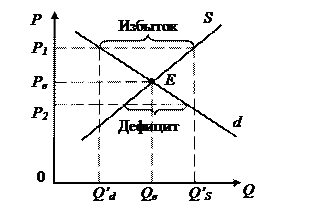 Рис. 2.9. Воздействие на рыночное равновесие потоварной дотации Из рис. 2.9 видно, каким образом распределяются выгоды от дотации V между покупателя и продавцами на рынке. Продавец получает выигрыш в размере (P+ – Pе1), что будет составлять его часть дотации. Получит выигрыш и покупатель в виде снижения равновесной цены товара на величину (Pе1 – Pе2). Соотношение между частями, на которые делится дотация, также зависит от углов наклона кривых спроса и предложения. Случается, что объем спроса не зависит от цены товара (лекарства для больных диабетом или онкологическими заболеваниями), тогда кривая спроса параллельна оси цен, и покупатели получают всю дотацию целиком. Фиксированные цены. Помимо использования налогов и дотаций государство может применять и гораздо более грубые методы вмешательства в рыночные механизмы. В частности, государство может устанавливать фиксированные цены. Рассмотрим рис. 2.10. Государство может установить фиксированную цену на уровне как превышающем цену равновесия (Р1 > Pе), так и ниже ее (Р2 < Pе). В первом случае возникает избыток продукции, во втором случае – дефицит. В обоих случаях объем продаж будет ниже равновесного объема Qе. В первом случае будет реализовано Q'd единиц продукции, во втором – Q'S. Фиксированные цены, превышающие цены равновесия, устанавливаются в некоторых странах на сельскохозяйственную продукцию. Эта практика в значительной мере объясняется тем политическим давлением, которое оказывают на правительство сельскохозяйственные производители. Обратим внимание на то, что правительство не может ограничиться только установлением фиксированной цены. Ведь возникает избыток продукции, с которым нужно что-то делать. Правительству не остается ничего другого, как закупать весь этот избыток на деньги налогоплательщиков.