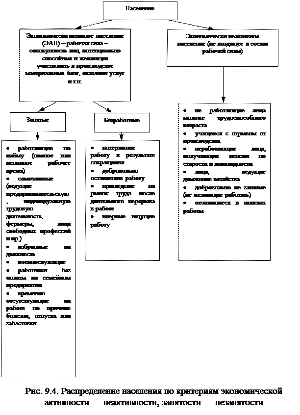 Явление безработицы характерно для экономики любой развитой страны. Неполная занятость воспринимается чаще всего как социальное зло, и государство в своей экономической политике стремится к достижению полной занятости. Но прежде чем давать нормативные оценки безработице, необходимо определить суть этого понятия. Безработица – это социально-экономическое явление, при котором часть экономически активного населения, способного и желающего трудиться, не имеет рабочего места, дающего право на получение дохода. По определению международной организации труда (МОТ), безработным является человек, который не работает, готов приступить к работе, находится в трудоспособном возрасте и активно ищет работу. В Российской Федерации к признанным безработным (имеющим статус безработного и право на пособие) относятся трудоспособные (не являющиеся инвалидами I и II групп) лица трудоспособного возраста (женщины от 15 до 54, мужчины от 15 до 59 лет), не имеющие работы, зарегистрированные в службе занятости в качестве ищущих работу и готовые приступить к ней, которым служба занятости не может подобрать подходящую работу в течение 10 дней после первичной регистрации. Однако данные об абсолютной численности безработных слабо характеризуют ситуацию, напряженность на рынке труда. Более наглядными являются удельные показатели, демонстрирующие долю тех, кто не может найти работу, в общей численности желающих работать. Для пояснения расчета этого показателя необходимо выделить группы населения по экономической активности – неактивности, занятости – незанятости (рис. 9.4). В сумме лица, относящиеся к занятым и безработным, представляют рабочую силу страны, тогда количественно уровень безработицы определяется следующим образом: