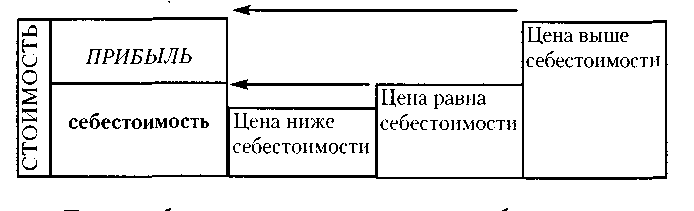 Рис. 4.5. Распределение прибыли Схема 4.5. Соотношение величины себестоимости и цены Рисунок 4.13. Эффект возрастающей экономии от масштаба Вторым фактором, влияющим на величину прибыли является уровень цен, по которым фирма (производитель) сбывает (продает, реализует) произведенный выпуск. Допустим, уровень цен меняется (увеличивается или уменьшается). Как это сказывается на прибыли производителя? Понятно, что чем выше уровень цен – тем больше прибыль, чем ниже – тем меньше ее величина. Теперь необходимо соотнести уровень цен со значением себестоимости. Если цена ниже себестоимости продукции, то фирма производит продукцию и реализует ее себе в убыток. Если цена на продукцию совпадает с величиной себестоимости, это значит, что цена равняется затратам на производство продукции, то есть такой уровень цен обеспечивает самоокупаемость продукции. Прибыль фирмы при этом принимает нулевое значение. Самоокупаемость продукции характеризует ситуацию, при которой стоимость продукции совпадает с ее себестоимостью. Значит, в упрощенном виде соотношение величины себестоимости и цены можно рассмотреть на схеме 4.5.