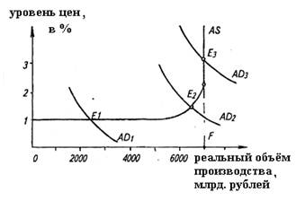Характер кривой АD говорит о том, что при повышении уровня цен масштаб реального объема производства будет меньше и наоборот. На совокупный спрос воздействуют неценовые факторы: изменения в потребительских, инвестиционных, государственных расходах; в расходах на чистый объем экспорта. При прочих равных условиях воздействие неценовых факторов сдвигает кривую АD вправо или влево. Кривая совокупного предложения АS отражает изменения совокупного реального объема производства всех конечных товаров и услуг в связи с изменением уровня цен. На совокупное предложение воздействуют неценовые факторы: изменения цен на ресурсы, изменения в производительности, изменения правовых норм. При прочих равных условиях воздействие неценовых факторов сдвигает кривую АS вправо или влево. В масштабе всей экономики могут сложиться три различных ситуации: состояние неполной занятости – отражено на отрезке горизонтальной части кривой совокупного предложения; состояние, приближающееся к уровню полной занятости, т.е. возрастающий отрезок; состояние полной занятости, что отражено графически вертикально. Таким образом, кривая АS как бы "склеена" из трех отрезков: горизонтального, промежуточного и вертикального. Горизонтальный отрезок в экономической литературе называется "кейнсианским", а вертикальный – "классическим". Кривая АS отражает динамику издержек производства на единицу продукции в связи с изменением уровня цен. Эти издержки не изменяются на горизонтальном отрезке, но растут на промежуточном и вертикальном отрезках. Пересечение кривых совокупного спроса и совокупного предложения определяет равновесный уровень цен и равновесный реальный объем национального производства. Макроэкономическое равновесие – это такое состояние экономики, когда весь произведенный национальный продукт полностью куплен (национальный доход равен совокупным расходам). На графике (рис. 18) представлены три варианта возможного макроэкономического равновесия. Точка Е1 – это равновесие при неполной занятости без повышения уровня цен, т.е. без инфляции. Точка Е2 – это равновесие при небольшом повышении уровня цен и состоянии, близком к полной занятости. Точка Е3 – это равновесие в условиях полной занятости, но с инфляцией. Принципиально отлична кейнсианская модель макроэкономического равновесия.