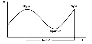 Цикличность – это форма движения национальной экономики, мирового хозяйства в целом, предполагающая смену революционных и эволюционных стадий развития экономики, экономического прогресса. Цикл представляет собой интервал времени в развитии рыночной экономики, в течение которого происходит увеличение объема производства товаров и услуг, а затем сокращение, спад, депрессия, оживление и, наконец, снова его рост (см. рис. 22). Кризис рыночной экономики характеризуется резким спадом производства, который начинается с постепенного сужения, сокращения деловой активности. Он сопровождается стремительным падением цен, банкротством банков, остановкой предприятий (фирм), ростом процента и безработицы. За спадом следует период депрессии (стагнация), который характеризуется застойным состоянием рыночной экономики, слабым спросом на потребительские товары и услуги, значительной нагрузкой предприятий, массовой безработицей, снижением уровня жизни населения. С кризисом кончается предыдущий период развития и начинается следующей. Кризис – важнейший элемент механизма саморегулирования рыночной системы хозяйства. За депрессией следует оживление. В этот период происходит восстановление деловой активности в форме заключения новых хозяйственных договоров, постепенное небольшое увеличение спроса на рабочую силу, следовательно, сокращение безработицы, рост потребительского спроса. Затем начинается чистый рост, который характеризует постоянное, нарастающее увеличение объема производства товаров и услуг. Высшая точка этого подъема характеризуется как бум.