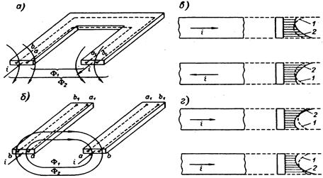 Возьмем два параллельных проводника, обтекаемых переменным током. В том случае, когда проводники обтекаются токами резных направленный (рис 6, а), ближние слои (а. а1) проводников охватываются меньшим магнитным потоком (Ф1 <Ф2) чем удаленные слои (b, b1). Индуктивность слоев, охваченных меньшим потоком, меньше: и сопротивление меньше сопpoтивления параллельных, более удаленных слоев. Плотность тока в ближних слоях будет большей (рис.6. в, кривая 2). При токах одного направления (рис. 6. б) меньшим магнитным потоком охватываются более удаленные слои проводников (Ф2 <Ф1). Плотность тока будет большей в удаленных слоях (рис 6,.г.) Эффект неравномерного распределения тока по сечению проводника, обусловленный близостью второго проводника с током, называется эффектом близости. Как и поверхностный эффект, он ведет к увеличению потерь мощности в проводнике, которые учитываются коэффициентом близости кб.