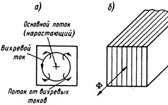 Рисунок 7 - Схема возникновения вихревых токов (а) и направление шихтовки магнитопроводов (б).
