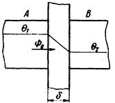 Теплопроводящие свойства среды характеризуются коэффициентом теплопроводности, численно равным количеству теплоты, проходящей через площадку 1 м2 в течение 1 с при перепаде температуры 1 К/м. Этот коэффициент обозначается λ и измеряется в ваттах на метр-Кельвин. Если два тела А и В с температурами Θ1 и Θ2 разделены третьим (плоской стенкой) с теплопроводностью λ и если считать, что теплота распространяется только в одном направлении, то изменение температуры в стенке происходит по прямой (рис. 2-4).