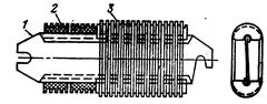 Для пуска двигателей мощностью до 10 кВт широко применяются так называемые проволочные или ленточные поля (рис. 31), иногда называемые рамочными резисторами. На стальной пластине 1 укреплены изоляторы 2 из фарфора или стеатита. Константановая проволока 3 наматывается в канавки на поверхности изоляторов. Для резисторов на большие токи используется лента. Коэффициент теплоотдачи, отнесенный к поверхности проволоки, составляет всего
