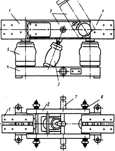 Пример исполнения разъединители внутренней установки приведен на рис. 42. Полюс разъединителя состоит из неподвижных контактов 1, укрепленных на опорных изоляторах 5. Неподвижные контакты охватываются подвижным контактом 2. состоящим из двух ножей. Контактное нажатие создается пружинами 6. Компенсация электродинамических сил в контактах происходит за счет одинаково направленных токов в подвижных ножах. Привод контактов осуществляется через приводной вал 7, соответствующие рычаги и тяговый изолятор 3. Собирается разъединитель на раме 4.