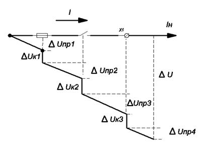Для простой цепи с сосредоточенной нагрузкой падение напряжения в цепи складывается из падения напряжения в проводе ΔUпр и падения напряжения в переходном сопротивлении контакта ΔUкон. ΔUдоп = ΔUпр + ΔUкон = I×ρl/S + IΣRкон. Из этого уравнения сечение провода S = I×ρl/ (ΔUдоп – IΣRкон). Для цепи с равномерно распределенной нагрузкой падение напряжения в линии складывается из двух составляющих ΔUдоп = ΔUL1 + ΔUL2