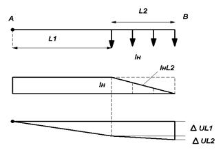 Рис.2.3 При одинаковом сечении провода на участках L1, L2 ΔUL1 = Iн×ρL1/S, ΔUL2 = IнL2×ρL2/S, IнL2 находим из соотношнения, (Iн × L2)/2 = IнL2×L2, или IнL2 = Iн/2 ΔUдоп = Iн×ρL1/S + Iн×ρL2/2S Из этого уравнения находим сечение провода S = Iн×ρ(L1 + L2)/ 2ΔUдоп.
