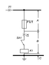 F-предохранитель; К- обмотка реле; SA- контакты реле; Uc- напряжение сети.