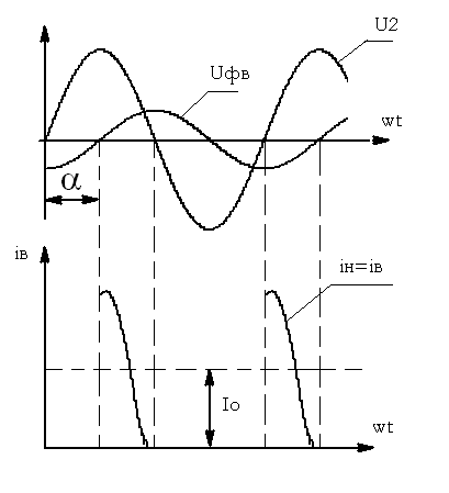 В случае, если ФВ создаст сдвиг α между анодом и сеткой, то ток через тиратрон начнет протекать с задержкой на величину α (когда на аноде и сетке «+»), поэтому величина постоянной составляющей выпрямленного тока нагрузки будет меньше, чем при неуправляемых вентилях. Если α = 0, то картина будет такой, как у неуправляемых вентилей, а если Недостатком данной схемы является большая пульсация, для устранения которой необходимо ставить более сложные фильтры.