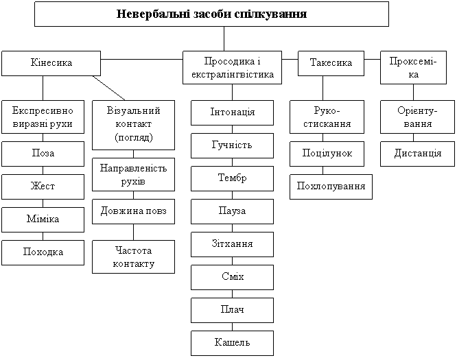Схема 1. Невербальні засоби комунікації До основних засобів невербальної комунікації належать його зовнішній вигляд, мовне дихання, пантоміміка, міміка, контакт очей (візуальний контакт), міжособистісний простір. Мовне дихання. Його основою є діафрагмально-реберний подих, коли вдих і видох відбуваються за рахунок зміни обсягу грудної клітки внаслідок скорочення діафрагми, міжреберних і черевних м'язів. У професійній діяльності (спів, промова в класі, виступ з лекцією) потрібне фонаційне дихання (вдихання коротше від видихання). Розрізняють кілька видів дихання: верхнє (ключичне), грудне (реберне), черевне (діафрагмальне). При активному мовленні перевагу віддають діафрагмальному диханню, яке коливається за висотою, частотою, глибиною. Неправильний подих породжує недостатню звучність (тобто силу, гнучкість, рухливість), що у свою чергу змінює тембр голосу. Процес голосоутворення найбільш продуктивний, коли спина пряма, міцна, а руки, плечі, шия, органи артикуляції вільні і не напружені. Технічна сторона звучної мови піддається тренуванню шляхом спеціальних вправ. Пантоміміка — виражальні рухи всього тіла або окремої його частини. Вона допомагає виділити в зовнішності головне — образ. Гарна, виразна постава (пряма хода, зібраність) виражає внутрішню гідність, впевненість педагога у своїх силах. Жести мусять бути органічними і стриманими, доцільними. Вони бувають описовими й психологічними. Описові (показ розміру, форми, швидкості) ілюструють хід думки, психологічні виражають почуття (на подив вказують розведені в сторони руки, застереження — притиснутий до губ палець руки). Для того, щоб спілкування було активним, слід дбати, щоб поза була відкритою, не схрещувати рук, стояти обличчям до класу, витримувати дистанцію, яка створює ефект довіри. Доцільно рухатися вперед і назад по класу, а не в сторони. Крок уперед підсилює значущість повідомлення, допомагає зосередити увагу аудиторії. Відступаючи назад, промовець начебто дає можливість слухачам перепочити. Міміка — виражальні рухи м'язів обличчя. Обличчя повинно не лише виражати, а й приховувати деякі почуття: не слід «нести» до класу тягар домашніх турбот, негараздів. Широкий діапазон почуттів виражають усмішка (посмішка), порухи брів, вираз очей. Контакт очей (візуальний контакт). Дослідники з'ясували, що, розмовляючи, люди дивляться одне на одного в середньому 35—50 відсотків часу, протягом якого відбувається розмова. Погляд затримується на очах співрозмовника 5—7 секунд. На нього частіше поглядають, слухаючи, а не тоді, коли говорять самі. Співрозмовники дивляться одне на одного переважно для того, щоб побачити реакцію на свої слова. Тривалий погляд мовця, спрямований на співрозмовника, підтверджує сказане.Найменшою семантичною одиницею вважають кін, кінему (грец. kinema — рух), які утворюють кінеморфи (щось подібне до фраз). Саме вони і сприймаються у процесі обміну інформацією. Вирази обличчя класифіковано за методикою FAST — Facial Affect Scoring Technique. її принцип полягає в поділі обличчя горизонтальними лініями на три зони (очі й чоло, ніс і ділянка носа, рот і підборіддя) та виокремленні шести основних емоцій, які найчастіше виражаються за допомогою мімічних засобів: радість, сум, страх, гнів, подив, відраза. (Окремі з них охарактеризовано у табл.). Таблиця Мімічні коди емоційних станів