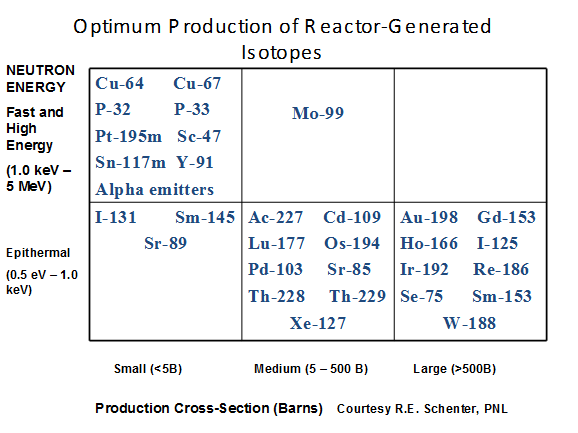 Задача 3.3. Сравнить два способа получения 99Mo, являющегося генератором наиболее используемого радионуклида 99mTc, в реакциях 98Mo(n,g)99Mo и 235U(n,f)99Mo. В первом случае возможно облучение молибдена природного изотопного состава (24,1% 98Mo) или обогащенному по 98Mo до 90% и более. Стоимость на единицу активности 99Mo по реакции 98Mo(n,g)99Mo на порядок ниже, чем при переработке облученного 235U, и в производстве практически отсутствуют радиоактивные отходы. Однако удельная активность 99Mo в этом случае значительно ниже удельной активности 99Mo, получаемого из осколков деления урана. Поскольку при делении урана, кроме 99Mo образуется большое количество сопутствующих осколков деления, суммарная активность которых более чем на порядок выше извлекаемого молибдена, возникает проблема ликвидации высокоактивных отходов. Радионуклиды, получаемые в реакторах.