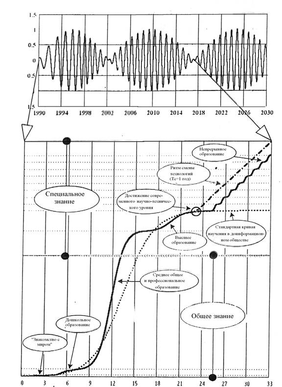 Как показано на первом из рисунков, за 20-й век скорость изменения технолого-экономического окружения успела сравняться (к середине 70-х гг.), а затем и превзойти скорость смены поколений. Таким образом, сейчас за время активной жизни одного поколения сменяется несколько окружений. Это радикально меняет судьбу любого специалиста.