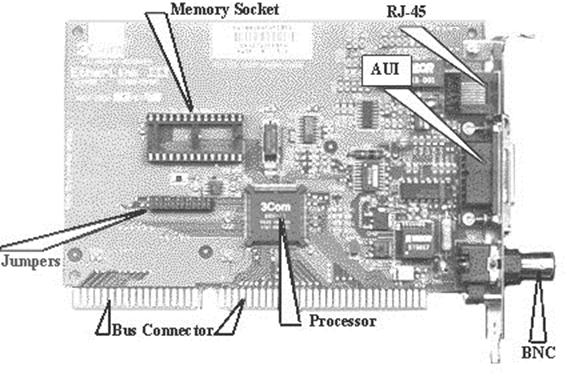 Сетевые адаптеры производят семь основных операций при приеме или передачи сообщения: 1. Гальваническая развязка с коаксиальным кабелем или витой парой. Для этой цели используются импульсные трансформаторы. Иногда дя развязки используются оптроны. 2. Прием (передача) данных. Данные передаются из ОЗУ ПК в адаптер или из адаптера в память ПК через программируемый канал ввода/вывода, канал прямого доступа или разделяемую память. 3. Буферизация. Для согласования скоростей пересылки данных в адаптер или из него со скоростью обмена по сети используются буфера. Во время обработки в сетевом адаптере, данные хранятся в буфере. Буфер позволяет адаптеру осуществлять доступ ко всему пакету информации. Использование буферов необходимо для согласования между собой скоростей обработки информации различными компонентами ЛВС. 4. Формирование пакета. Сетевой адаптер должен разделить данные на блоки в режиме передачи (или соединить их в режиме приема) данных и оформитьв виде кадра определенного формата. Кадр включает несколько служебных полей, среди которых имеется адрес компьютера назначения и контрольная сумма кадра, по которой сетевой адаптер станции назначения делает вывод о корректности доставленной по сети информации. 5. Доступ к каналу связи. Набор правил, обеспечивающих доступ к среде передачи. Выявление конфликтных ситуаций и контроль состояния сети. 6. Идентификация своего адреса в принимаемом пакете. Физический адрес адаптера может определяться установкой переключателей, храниться в специальном регистре или прошиваться в ППЗУ. 7. Преобразование параллельного кода впоследовательный код при передачеданных, и из последовательного кода в параллельный при приеме. В режиме передачи данные передаются по каналу связи в последовательном коде. 8. Кодирование и декодирование данных. На этом этапе должны быть сформированы электрические сигналы, используемые для представления данных. Большинство сетевых адаптеров для этой цели используют манчестерское кодирование. Этот метод не требует передачи синхронизирующих сигналов для распознавания единиц и нулей по уровням сигналов, а вместо этого для представления 1 и 0 используется перемена полярности сигнала. 9. Передача или прием импульсов. В режиме передачи закодированные электрические импульсы данных передаются в кабель (при приеме импульсы направляются на декодирование). Сетевые адаптеры вместе с сетевым программным обеспечением способны распознавать и обрабатывать ошибки, которые могут возникнуть из-за электрических помех, коллизий или плохой работы оборудования. Последние типы сетевых адаптеров поддерживают технологию Plug and Play (вставляй и работай). Если сетевую карту установить в компьютер, то при первой загрузке система определит тип адаптера и запросит для него драйверы. Внешний вид адаптера показан на рис. 9.1.