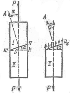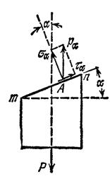 За положительное направление отсчета этого угла возьмем направление против часовой стрелки. Нормаль ОА, направленную наружу по отношению к отсеченной части стержня, будем называть внешней нормалью к сечению тп. Площадь сечения mk обозначим Fo, площадь же сечения тп обозначим Fa. Для нахождения напряжений, передающихся через намеченное сечение от верхней (I) части на нижнюю (II), отбросим мысленно верхнюю часть и заменим действие ее на нижнюю напряжениями рa. Для равновесия нижней части напряжения рa должны уравновешивать силу Р и быть направлены параллельно оси стержня. В данном случае напряжения уже не перпендикулярны к той площадке, по которой они действуют. Величина их тоже будет иной, чем для площадки mk. Сделав предположение, что в достаточном удалении от мест приложения внешних сил Р напряжения рa равномерно распределены по площади наклонного сечения тп, найдем
