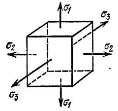 В каждой точке любого напряженного тела можно провести три взаимно перпендикулярные главные площадки, через которые передаются три главных (нормальных) напряжения; из них два имеют экстремальные значения; одно является наибольшим нормальным напряжением, другое – наименьшим, третье – промежуточное. В каждой точке напряженного тела можно выделить элементарный кубик; гранями которого служат главные площадки. Материал кубика растягивается или сжимается тремя взаимно перпендикулярными главными напряжениями, передающимися через эти грани (рис. 11.5). В случае простого растяжения одна главная площадка в каждой точке перпендикулярна к оси стержня (a=0°), а две другие параллельны этой оси (a=90°). Так как по первой главной площадке нормальное напряжение не равно нулю (sa≠0), а по двум другим оно обращается в нуль, то при простом растяжении и сжатии в каждой точке стержня из трех главных напряжений только одно не равно нулю; оно направлено параллельно растягивающей силе и оси стержня. Такое напряженное состояние материала называется линейным (или одноосным). Выделенный из стержня элемент растягивается лишь в одном направлении. На практике встречаются случаи, когда элемент материала, в виде кубика, подвергается растяжению или сжатию по двум взаимно перпендикулярным направлениям или по всем трем (рис. 5). Случай работы материала, когда два главных напряжения не равны нулю, называется плоским (или двухосным) напряженным состоянием. Если же все три главных напряжения не равны нулю в рассматриваемой точке, то налицо самый общий случай распределения напряжений в материале – объемное (трехосное) напряженное состояние; элементарный кубик будет подвергаться растяжению или сжатию по всем трем взаимно перпендикулярным направлениям. Главные напряжения условимся в дальнейшем обозначать буквами s1, s2, s3. Нумерацию главных напряжений установим таким образом, чтобы s1 обозначало наибольшее по алгебраической величине, а s3 – наименьшее напряжение. Таким образом, мы различаем три вида напряженного состояния: 1) объемное напряженное состояние – когда все три главных напряжения не равны нулю (например, случай растяжения или сжатия по трем взаимно перпендикулярным направлениям); 2) плоское напряженное состояние – когда одно главное напряжение равно нулю (случай растяжения или сжатия по двум направлениям); 3) линейное напряженное состояние – когда два главных напряжения равны нулю (случай растяжения или сжатия в одном направлении).