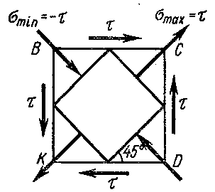 Если на гранях элемента действуют только касательные напряжения (рис.12.1), то такой вид напряженного состояния называется чистым сдвигом. Площадки, по которым действуют только касательные напряжения, называются площадками чистого сдвига.