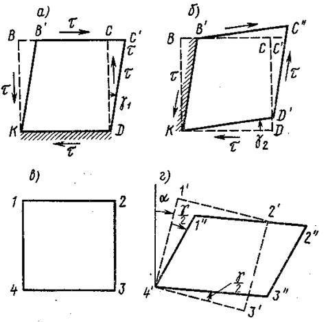 Так как отличны от нуля два главных напряжения, то сдвиг представляет собой частный случай двухосного напряженного состояния. Главные площадки наклонены под углом 45° к направлению площадок чистого сдвига (рис. 12.2). Рассмотрим теперь деформации при сдвиге. Элемент KBCD, прямоугольный до деформации (рис. 12.3, а), после деформации сдвига примет вид KB'C'D (грань KD считаем закрепленной). Угол g1 называется угловой деформацией или углом сдвига. Опыты показывают, что для многих материалов до известных пределов нагружения между напряжениями и деформациями при сдвиге имеет место линейная зависимость