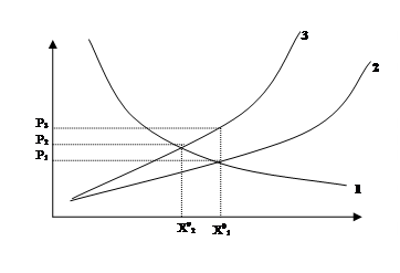 1-кривая спроса; 2-кривая предельных издержек на добычу ресурсов; 3-кривая предельных издержек на добычу ресурсов, изменившаяся из-за истощения относительно дешевых месторождений.