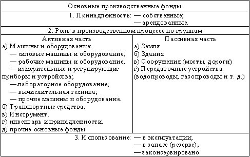 Классификация основных фондов Основные фонды предприятия Основные фонды — это средства труда, которые многократно участвуют в производственном процессе, при этом сохраняя неизменной свою натуральную форму, и которые переносят свою стоимость на готовую продукцию постепенно: по частям и по мере износа. Основные фонды в их денежном выражении называются основными средствами. Основные фонды предприятия подразделяются: – по функциональному назначению на производственные фонды, т.е. непосредственно связаны с производством продукции; непроизводственные фонды, к ним относится имущество социального назначения (жилые дома, детские и спортивные учреждения, столовые, базы отдыха и другие объекты культурно-бытового обслуживания трудящихся, находящиеся на балансе предприятий). – по использованию: на находящиеся в эксплуатации и находящиеся в запасе (резерве), законсервированы. – по принадлежности: на собственные фонды и арендованные. – по степени участи на активные фонды, которые непосредственно участвуют в производстве продукции, к ним относят машины и оборудование, транспортные средства и инструменты; и пассивные, обеспечивающие нормальное функционирование производственного процесса, такие как здания и сооружения, хозяйственный инвентарь. – по производственному назначению: - здания - производственные корпуса, склады, конторы, гаражи и т.п.; Состав и классификация основных производственных фондов приведены в табл. 1.