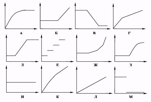 Требуется: 1. Рассчитайте линейную функцию затрат (переменную составляющую накладных расходов), относя общие 2. Чему равны предполагаемые накладные расходы для (а) 5 000 часов, и (б) 8 000 часов, используя функцию 3. Лоулеру представился шанс принять предложение об оказании услуг, которое вызвало бы увеличение Задание 2. Различные основы колебаний затрат. Выберите график, который подходит к пронумерованным данным по производственным расходам. Обозначьте буквой, какой график наилучшим образом подходит к описанному виду затрат или к ситуации. Вертикальные оси графиков выражают общую сумму затрат в у.е., а горизонтальные оси представляют объем производства в течение календарного года. Для каждой ситуации, пересечением двух осей служит нулевая точка у.е. и продукции. Графики могут быть использованы более одного раза. 1. Годовая амортизация оборудования, рассчитанная методом отработанных машино-часов. 2. Счет за электроэнергию — одинаковая постоянная сумма плюс переменные суммы после того, как 3. предполагаемое), составило бы 43 000 у.е. Какой маржинальный доход, фактически, был упущен? Задание 2. Различные основы колебаний затрат. Выберите график, который подходит к пронумерованным данным по производственным расходам. Обозначьте буквой, какой график наилучшим образом подходит к описанному виду затрат или к ситуации. Вертикальные оси графиков выражают общую сумму затрат в у.е., а горизонтальные оси представляют объем производства в течение календарного года. Для каждой ситуации, пересечением двух осей служит нулевая точка у.е. и продукции. Графики могут быть использованы более одного раза. 4. Годовая амортизация оборудования, рассчитанная методом отработанных машино-часов. 5. Счет за электроэнергию — одинаковая постоянная сумма плюс переменные суммы после того, как