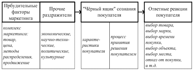 5.4. Модели покупательского поведения: экономическая, социологическая и психологическая На поведение потребителей оказывают влияние разнообразные факторы. Их делят на четыре основные группы: культурные (культура, субкультура, социальное положение), социальные (референтные группы, семья, роли, статусы), личностные (возраст и этап жизненного цикла семьи, род занятий, экономическое положение, образ жизни, тип личности и представление о самом себе), психологические (мотивация, восприятие, усвоение, убеждение и отношения). В маркетинге, где конечной целью является потребитель, важно уметь моделировать его поведение на рынке. С этой целью строятся различные модели. Они дают ответ на вопрос о том, каким образом потребитель реагирует на те или иные маркетинговые стимулы к приобретению товара. Основой для построения всех моделей является базовая маркетинговая модель, в которой потребитель рассматривается в качестве «черного ящика». Главная задача исследователя - понять, что происходит в «чёрном ящике» сознания потребителя и как получить ответную реакцию, используя раздражители.