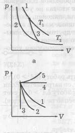 При любых других процессах (неизотермических и неадиабатических) всегда можно связь между р и V написать в виде (37), но γ уже не будет равна Ср/СV. В этих случаях процесс называется политропическим, а γ – показателем политропы. Можно сказать, что для изотермического (T =const) процесса γ = 1, для изобарического (р = const) γ = 0, для изохорического (V = const) γ = ∞. На рисунке б показаны различные процессы расширения газа: 1 – изотерма, 2 – адиабата, 3 – изохора, 4 – изобара, 5 – политропа. Процессы 2, 3 идут с охлаждением, а 4, 5 – с нагреванием газа.