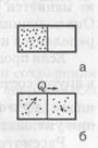 Другой пример: пусть газ находится и слева и справа от теплопроводной перегородки, но температура слева выше, чем температура справа (рис. б). Молекулы обмениваются с перегородкой кинетической энергией, и постепенно температуры обеих частей выравниваются. Такой процесс передачи тепла всегда необратим. Самопроизвольно средняя кинетическая энергия молекул (т. е. температура) слева сама не поднимется за счет кинетической энергии молекул справа. Любой процесс, сопровождающийся трением, также необратим, так как при этом энергия упорядоченного движения переходит в энергию беспорядочного движения молекул, т. е. в теплоту. Пусть с рабочим веществом совершаются циклы, при каждом из которых подводится от нагревателя Q1, отдается холодильнику Q2 и производится работа А = Q1 – Q2. Из (38) и (39) можно получить: